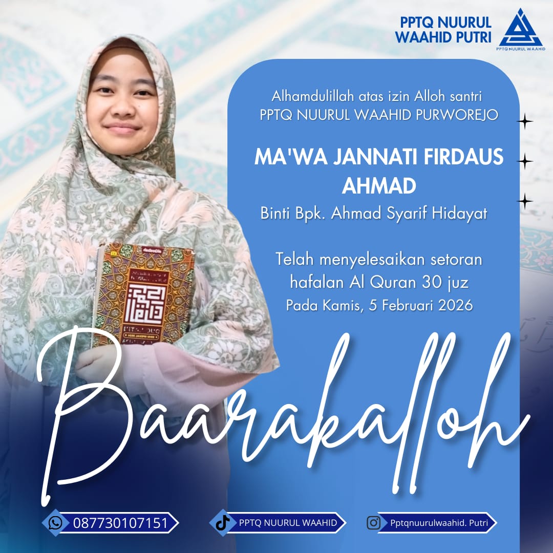 Dengan rasa syukur yang tak terhingga, ukhti Ma’wa Jannati Firdaus Ahmad binti Ahmad Syarif Hidayat asal Garut dinyatakan bahwa pada kamis, 05 Februari 2026 telah menyelesaikan hafalan 30 juz Al-Qur’an.✨